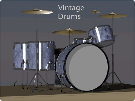 In about 2000, I created a 3D model of the drums in Carrara. Since I'm now using "MODO", it seems like a good time to update and improve the model. For you drummers out there, the sizes are: 14" X 26" bass drum, 9" X 13" mounted tom, (2) 16" X 16" floor toms, 5 1/2" X 14" snare drum. The cymbals are 20" ride, 14" hi-hats, (2) 18" crash cymbals, and 6" splash cymbal. This model is now available in my 3D Catalog.