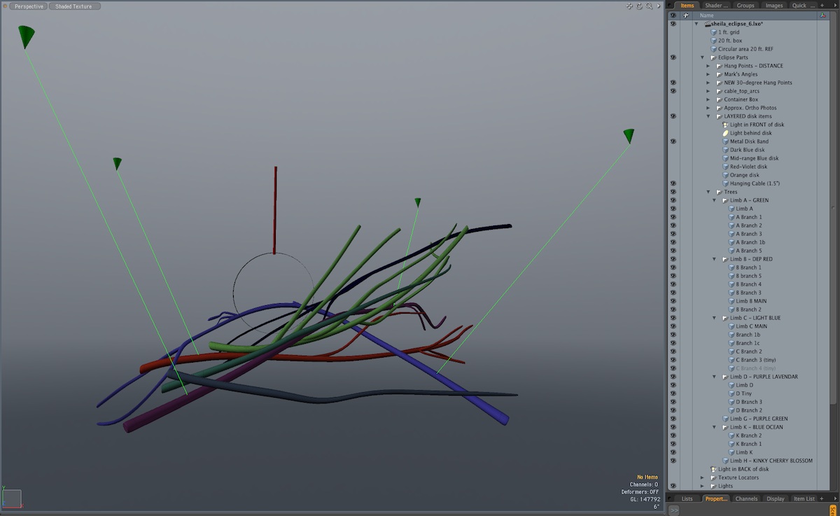 Finally, I had a chance to go out and spend all day with the piece, while it was being assembled. That particular day is the one that solved most of the problems. I took my laptop, with MODO 302, a tape measure, and a notepad, and simply spent all day measuring, taking photos, and adjusting the 3D model. What finally worked best was to create a grid with string on the ground, under the assembled piece. I then measured from the ground upward to a variety of reference points on each branch. After another couple of (shorter) sessions with Sheila, we were finished with the "branches" part of the problem.