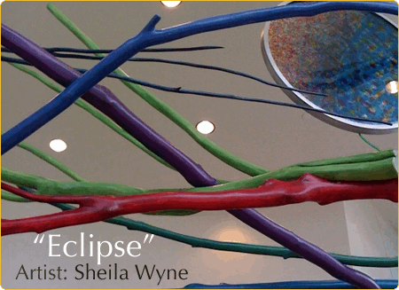 There are times that I do 3D visualization work for other artists. In this case, my job (and my pleasure) was to create a scale model of my amazingly-talented artist friend Sheila Wyne's piece, called "Eclipse". It's a large organic piece, approximately 20 feet wide, 10 feet tall, and ten feet deep, installed in the lobby of the new Northrim Bank, here in Anchorage. It's composed of a variety of actual tree branches, sanded, dried, and stained, along with a 24-inch diameter, multi-layer glass disk. (Details later) This page is as much about remaining flexible for the client, as it is about modeling. It all came together in the end, and I'm pleased to have been part of it.. Thank you, Sheila!