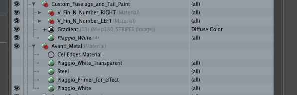 If I toggle the “Custom_Fuselage_and_Tail_Paint” mask off, I can simply toggle the masks on and off in the layer below (“Avanti_Metal”) to depict the model with it’s overall base white metal color, in a painted “primer” color, or an unpainted “Steel” color. By toggling the masks just above that, I can make the outer skin transparent, and if I like, I can add the Cel Edges material to add a bit of definition to the transparent skin seams.