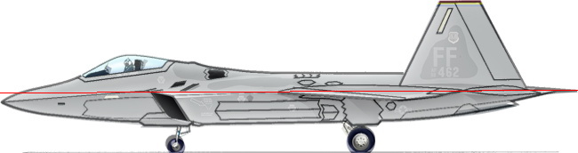 Here's the Lockheed Martin color cutaway, with the opacity turned down, so you can see that the (Lockheed Martin) line drawing underneath it does indeed match. (aside from the landing gear "squat angle", mentioned earlier) That's what made me believe that the color cutaways are a good as anything else, as a reference. The red line passing through the image shows the cruise "datum line" that I believe is valid for alignment of the major parts.