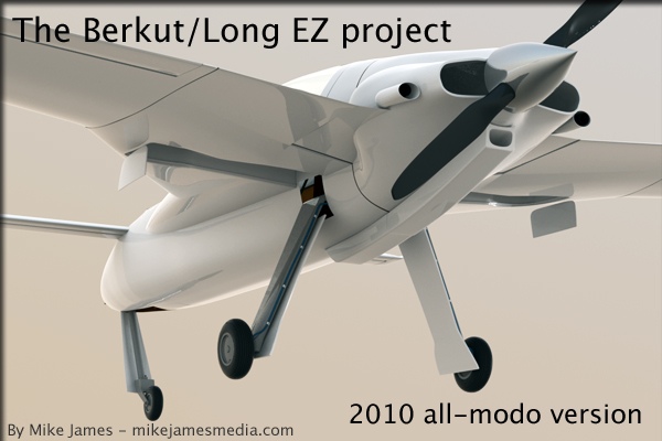 In about 2002, I built a 3D model of this aircraft in "Carrara", and also built a 1/3rd scale flying model, which was later used in some tests related to the Air Force's airborne laser project. ("MTHEL") You can view the previous article on my (NextCraft.com) archive site, at http://www.nextcraft.com/berkut01.html. This update, rebuilt entirely in MODO, is both more accurate and more detailed. The Berkut variant includes retractable main landing gear, and so that made it more interesting to model, too. (I'll add some Long EZ-style main landing gear later, for those who prefer that version. Otherwise, the two aircraft are very similar in their exterior shape.